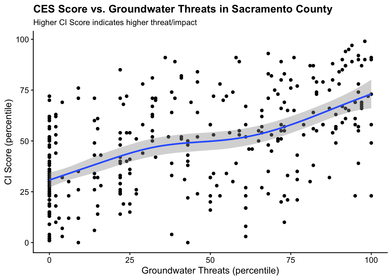 mapview(ces3_sac, zcol = "CIscoreP")Let’s make a static plot that shows the association between groundwater threats and the CES score. The trend is interesting, but what if we want to know what census tracts are associated with outliers (high or low) on this static plot?